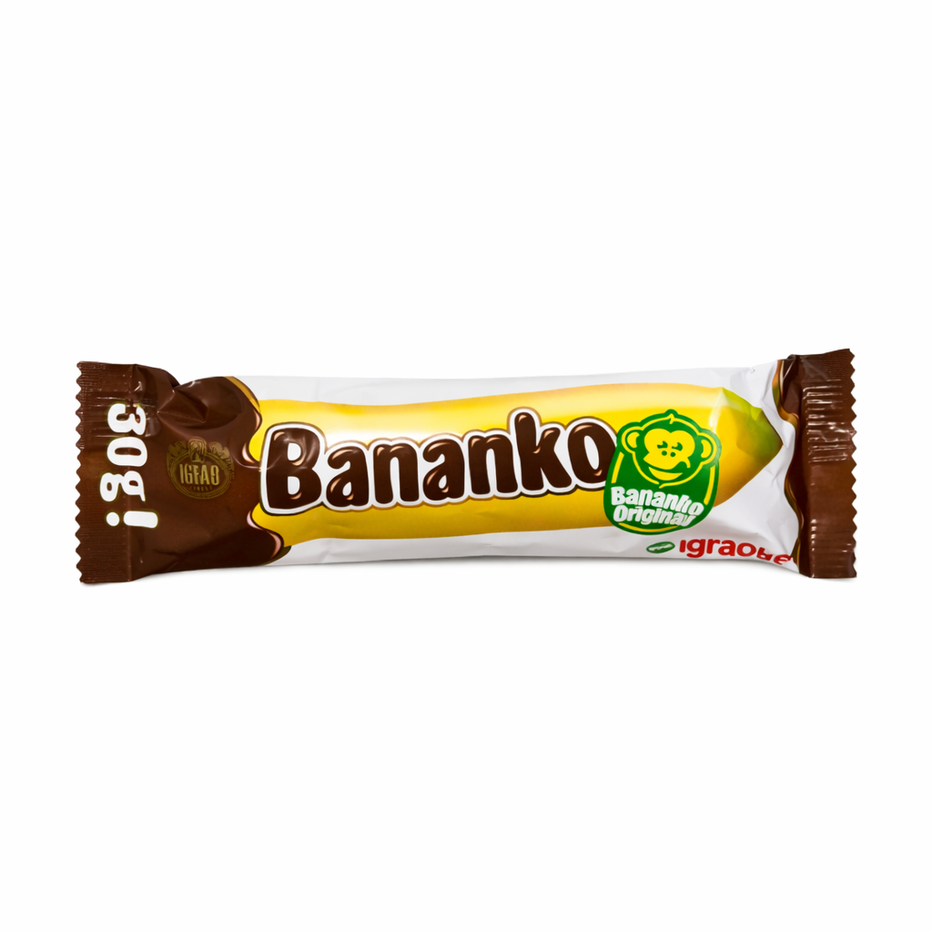 Zucker, Wasser, Glukosesirup, Kakaomasse, Kakaobutter, Geliermittel (E 406), Fruchtpulver 0,2% (Banane), Milcheiweiß, Säuerungsmittel (E 330), Emulgatoren (E 322 und E 476), Säureregulator (E 500ii), Aromen, Farbstoff (E 100). Das Produkt enthält Milch und Soja. Kann Spuren von Haselnüssen enthalten. Mit Farbstoff.